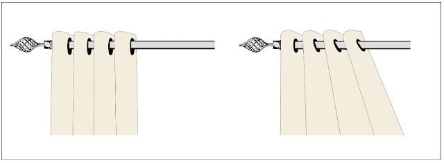 The final example illustrates full-on MacKenzie-Childs decor with window treatments that can definitely keep up! The drapery panels are tie-top, color-blocked panels. The panels are two widths of material each with 18" wide sections of red, blue, and yellow. There are 20 pointed jester ties made of a small-scale, black-and-white check on each panel. The drapery panels provide continuity in the open floor plan from the living room through the dining room to the sitting area.